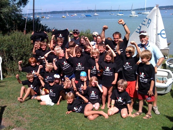 ![]() Christian Ramoser freut sich mit seiner Seeräubertuppe über die gelungene Segelwoche: " Ganz besonders möchte ich mich noch einmal bei allen Eltern für dieses tolle T-Shirt bedanken. Dieses Geschenk wird mich immer an diese lustige Jugendwoche erinnern. Trotzdem ist diese Woche aber nur deshalb zu so einem harmonischem und gelungenem Ereignis geworden, weil wirklich alle, Eltern, Trainer und Kinder so großartig mitgewirkt haben und stets mit gutem Rat, aber vor allem mit spontaner und ausdauernder Hilfsbereitschaft zur Stelle waren! |