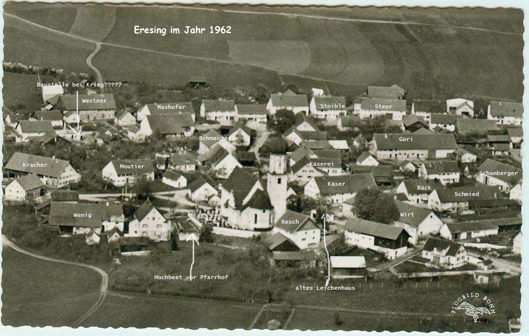 Luftbild aus dem Besitz der Fam. Wenig - Östlich der Kirche noch das Anwesen der Familie Resch, das der Friedhofserweiterung weichen musste.